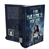 “A fierce woman in a white dress holds a sword with a stormy sky in the background. The title is bold and metallic.”