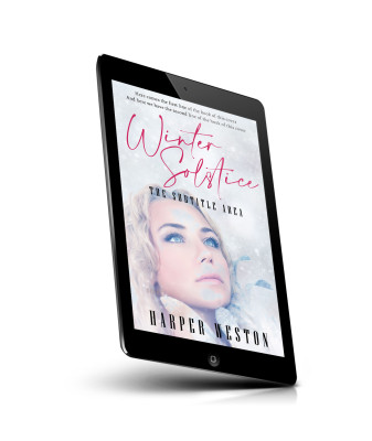 “A woman with blonde hair looks upwards against a snowy, winter-themed background. The title "Winter Solstice" is prominently displayed.”
