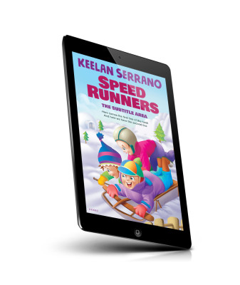 “Three children sledding down a snowy hill, all smiling and dressed in winter gear. Snowy background with an igloo visible.”