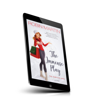 “A stylish woman in winter attire holding shopping bags stands next to the title "The Immense Play."”