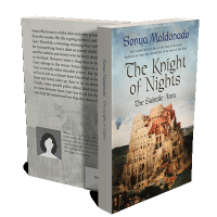 “Ancient tower against a cloudy sky, surrounded by greenery. Title and author text are prominent above the scene.”