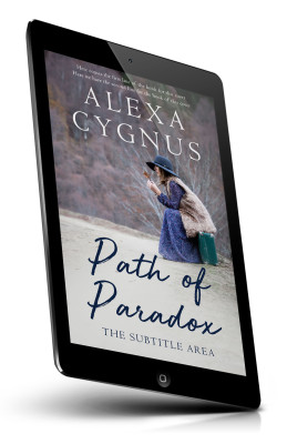 “A woman in a hat and fur vest sits on a suitcase outdoors, surrounded by nature. The image is a book cover titled "Path of Paradox".”