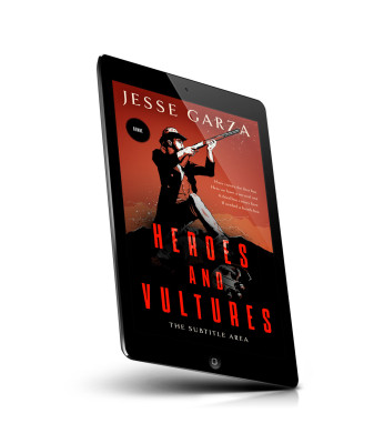 “A dramatic illustration of a man with a rifle, set against a red background, dominating the cover of a book titled "Heroes and Vultures."”