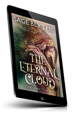 “A woman in a feathered headdress stands against a dreamy, cloudy background.”