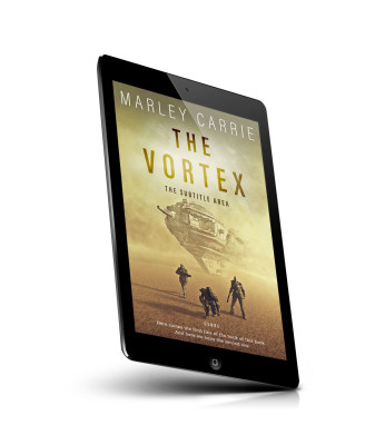 “Futuristic book cover with three figures in front of a large hovering spaceship in a dusty environment.”