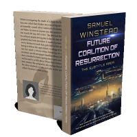“Futuristic cityscape with flying vehicles beneath a starry sky and glowing structures. The book cover has a sci-fi theme.”