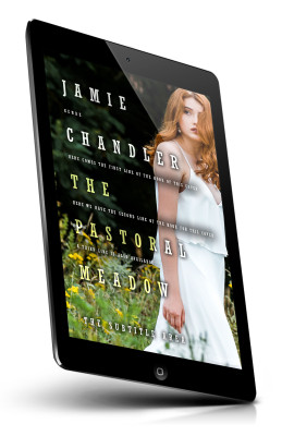 “A woman with red hair in a white dress stands in a meadow, looking over her shoulder.”