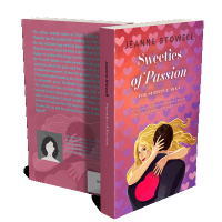 “A romantic book cover showing a couple embracing, with a woman wrapping her arms around a man's shoulders against a heart-patterned background.”