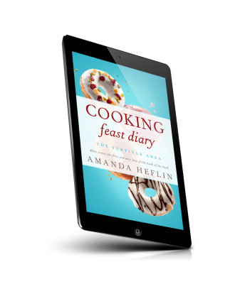“Four decorated donuts against a turquoise background with the text "COOKING feast diary" and an author's name.”