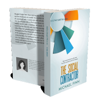 “A book cover with abstract patterns, titled "The Social Contractor" by Michael Finn.”