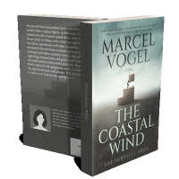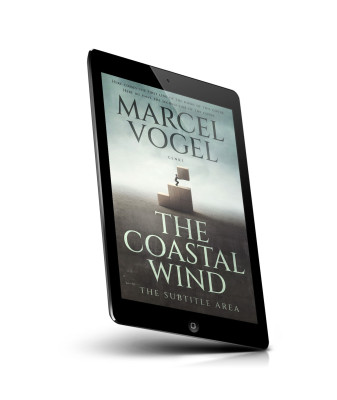 “A figure climbs stacked wooden blocks against a foggy, coastal backdrop with large text dominating the image.”