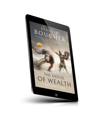 “Two ancient warriors in combat, one fallen and one standing triumphantly with a shield and sword, under a dramatic sky.”