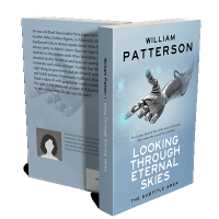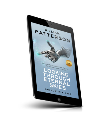 “A robotic hand reaches out on a futuristic-themed book cover with a light blue background.”