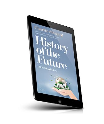 “Book cover with title "History of the Future" featuring a small globe with animals and plants in a hand.”