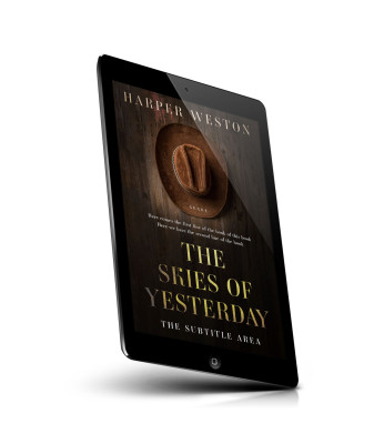 “A brown cowboy hat hangs on a dark wooden wall above the title "The Skies of Yesterday."”