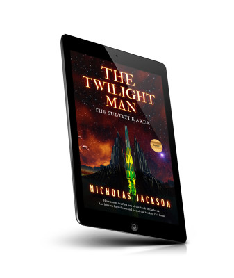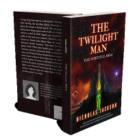 “A science-fiction book cover with futuristic dark structures, glowing elements, and a starry background.”