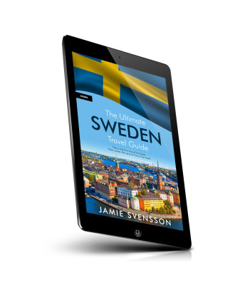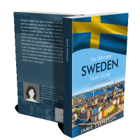 “A colorful cityscape of Sweden with historic buildings and a waterway, under a blue sky with the Swedish flag displayed at the top.”