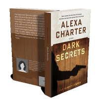 “A shadowed figure holds a gun against a wooden fence backdrop with "DARK SECRETS" prominently displayed.”