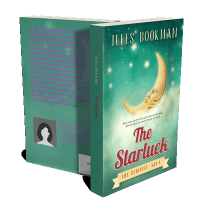 “A dreamy book cover featuring a crescent moon with a serene face among stars, set against a teal, starry sky background.”
