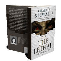 “A pair of sinister red eyes peer through a brick wall over a book cover with a dramatic title.”