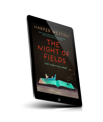 “A boat with a boy and girl sailing on an illustrated open book, with stars emerging from its pages against a black background.”