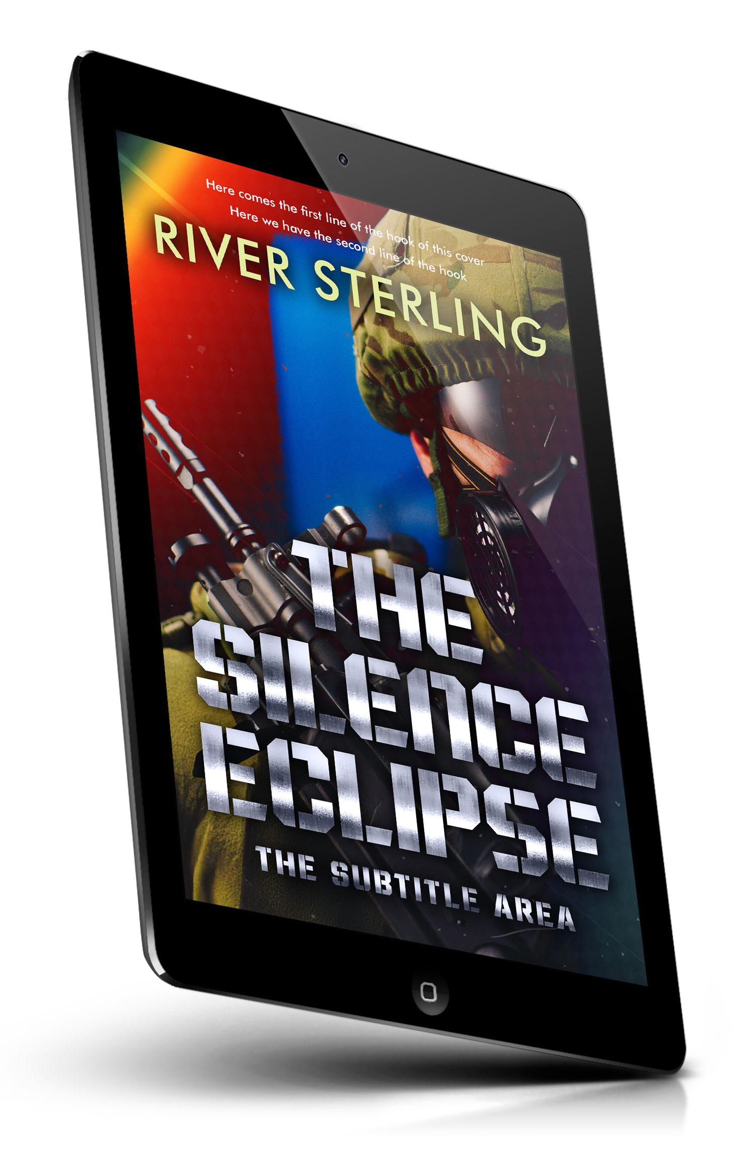 “A soldier in helmet and gas mask holds a rifle against a dramatic red-blue background, styled like an action book cover.”