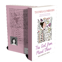 “A girl with a bun and striped dress stands among whimsical, colorful flowers. The background is white with decorative elements.”