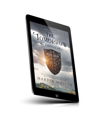 “A book cover with a medieval shield, cloudy sky, and mountain landscape. Title is "The Tomorrow." Author: Harper Weston.”