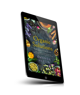 “An assortment of herbs and flowers arranged around a book titled "Organic Solutions" on a dark surface.”