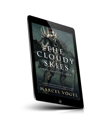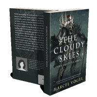 “A fantasy book cover features a dark armored warrior with a large sword, set against a stormy, ominous sky.”