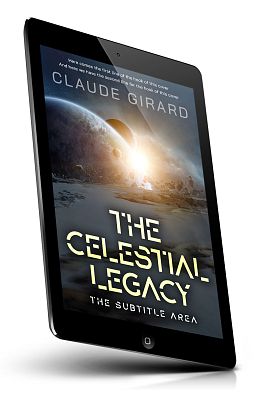 “A sci-fi book cover depicting a sunrise over a planet with multiple moons and asteroids in space. The title is "The Celestial Legacy."”