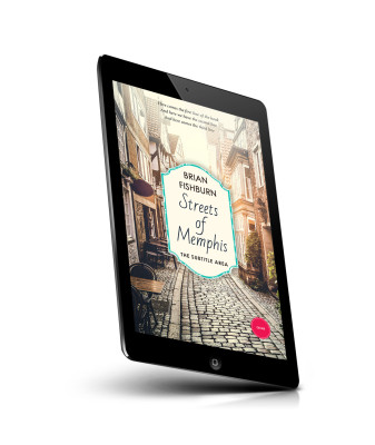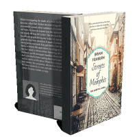 “A quaint, narrow European street with cozy buildings and cobblestone pavement, featuring a book cover titled "Streets of Memphis".”
