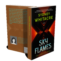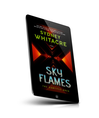 “A futuristic book cover with the title "Sky Flames," featuring a neon-lit geometric design with a dark background and intersecting red lines.”