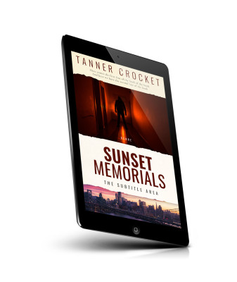 “A dark hallway with a silhouette figure, below is a sunset cityscape featuring a bridge.”