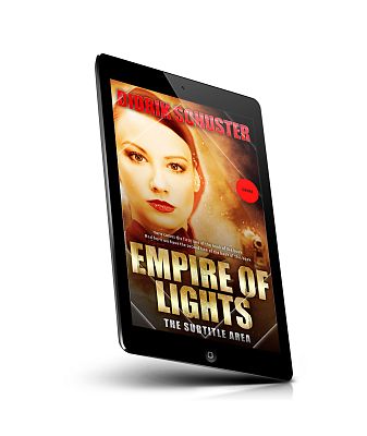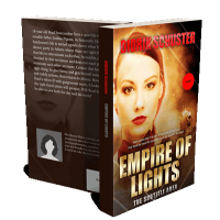“A woman with a serious expression stands against a fiery background with light beams. The text implies it's a book cover.”