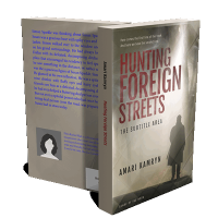 “A shadowed figure in a coat and hat stands in a misty, urban environment with towering buildings.”