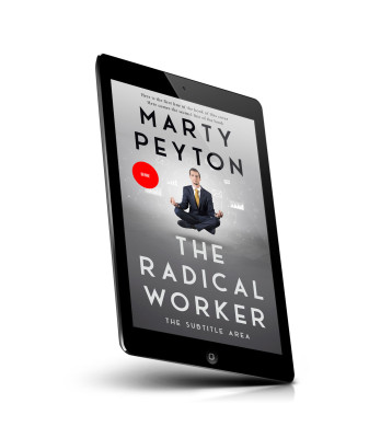 “A man in a suit sits cross-legged with a serene expression, surrounded by icons and graphics, on a grayscale background.”