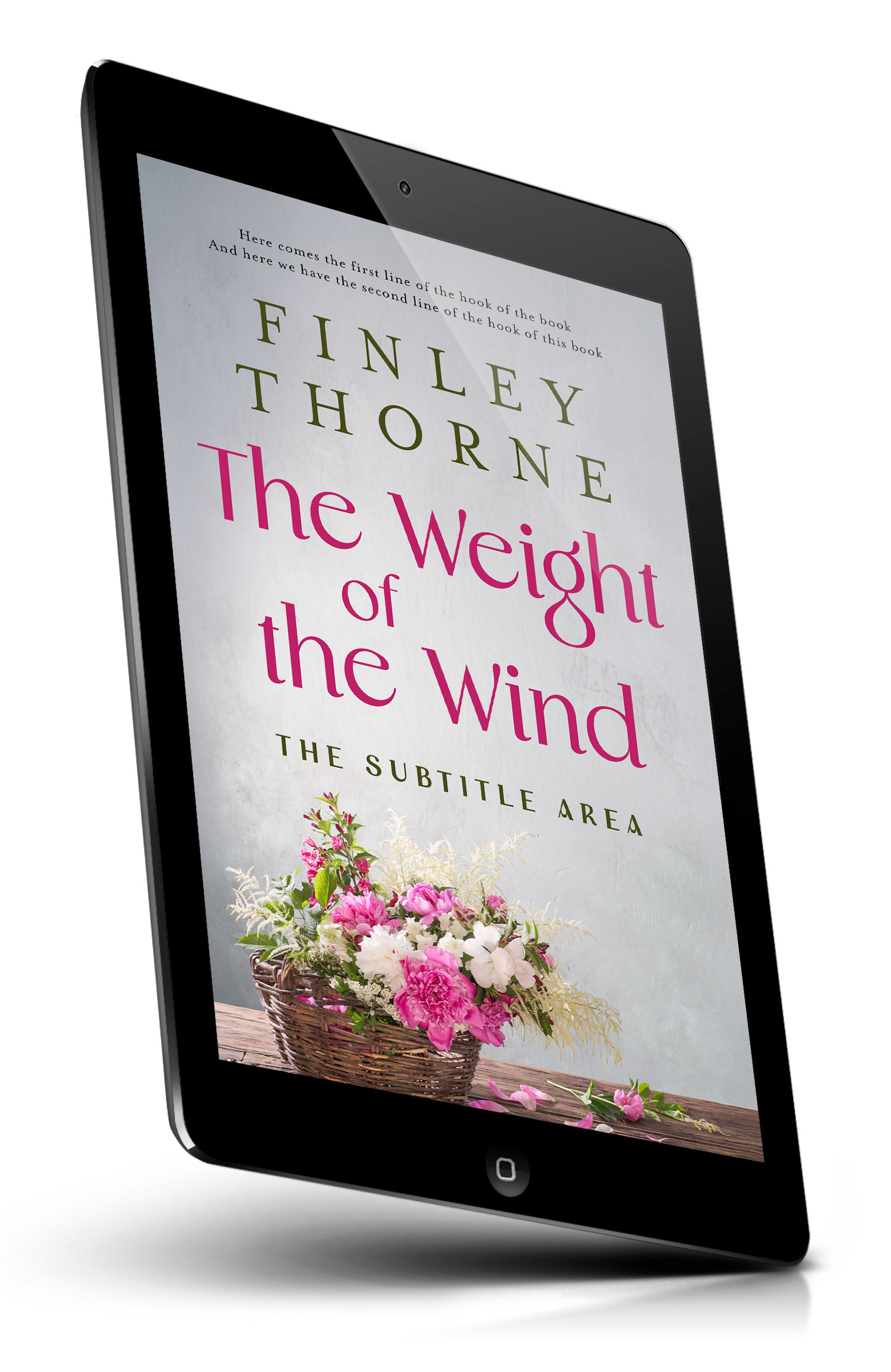“A minimalist book cover with a pale gray background and a wicker basket of pink and white flowers on a wooden table.”
