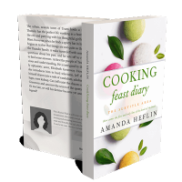 “Colorful macarons and green leaves on a white surface with a book cover about cooking.”