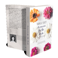“Colorful flowers surrounding a book cover titled "Memories for the Birds," featuring white daisies in the center.”