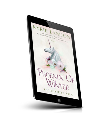 “A book cover featuring a white unicorn with flowers, soft pastel colors, and elegant text that reads "Phoenix of Winter" by Kyrie Landon.”