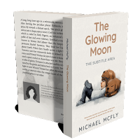 “A young child wearing a bear hat is sleeping next to a large, plush bear on a book cover titled "The Glowing Moon."”