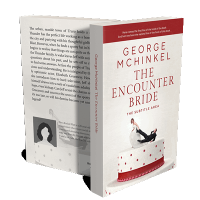“A book cover with a man and woman in wedding attire on a large cake, the woman pulling the man towards the edge.”