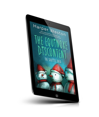 “Three snowmen wear red hats and scarves on a teal background with a book title and subtitle in the foreground.”