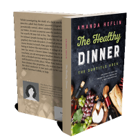 “A book cover featuring food items like wine, grapes, cheese, bread, and herbs on a dark background.”