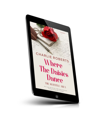 “A vintage quill and red rose rest on handwritten letters, with the book title "Where The Daisies Dance" prominently displayed.”