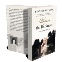 “A blonde woman in a white dress stands outdoors in a field with trees in the background. The book title is in large text above her.”