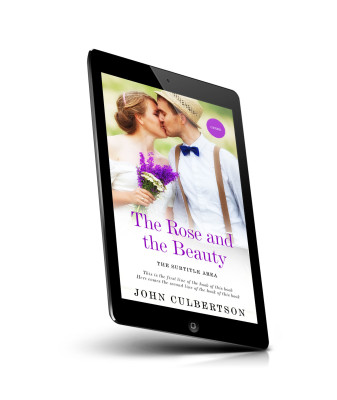 “A couple in wedding attire, the bride holding flowers, with a book title overlay.”
