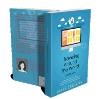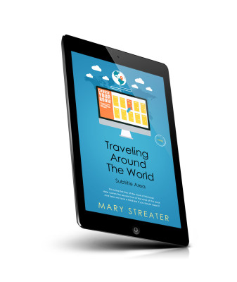 “A book cover with a travel theme featuring a computer monitor and room selection graphic against a blue background with a world map.”