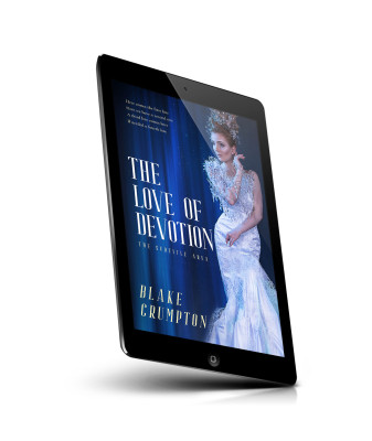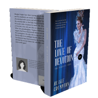 “A woman in an ornate white dress stands against a blue background under the title "The Love of Devotion."”